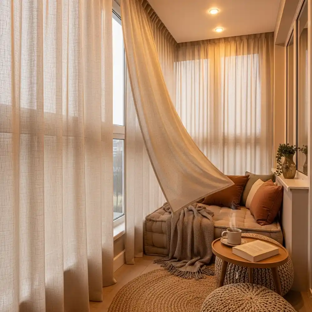 حجم البلكونة: بالنسبة للبلكونات الصغيرة، اختَر ستائر خفيفة وألوان فاتحة لتعزيز الإحساس بالاتساع